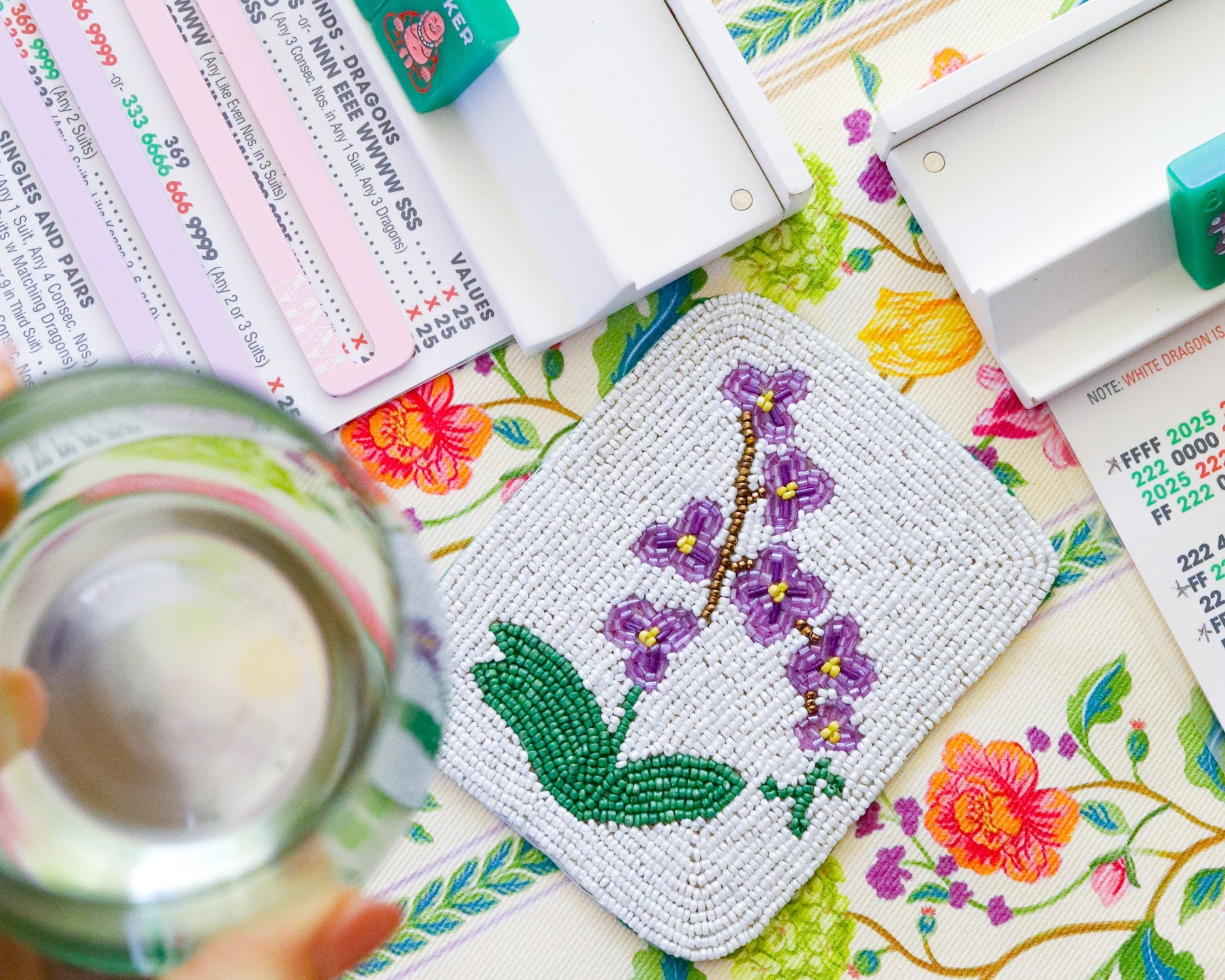 Introducing our newest Mahjong table accessory- the hand-beaded coaster collection. Two designs are available with our WINDS round coasters and the One Bird Bam Tile coasters.