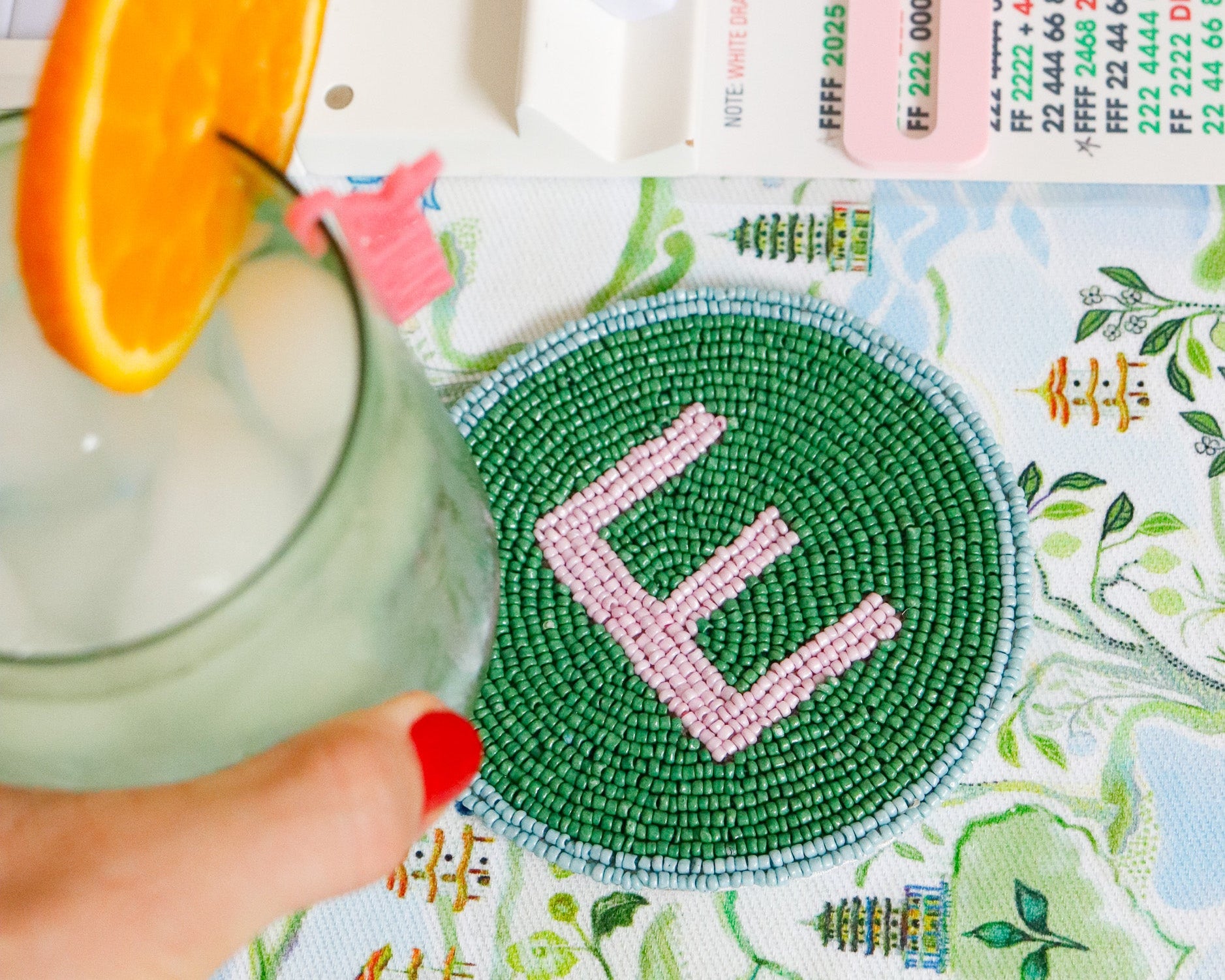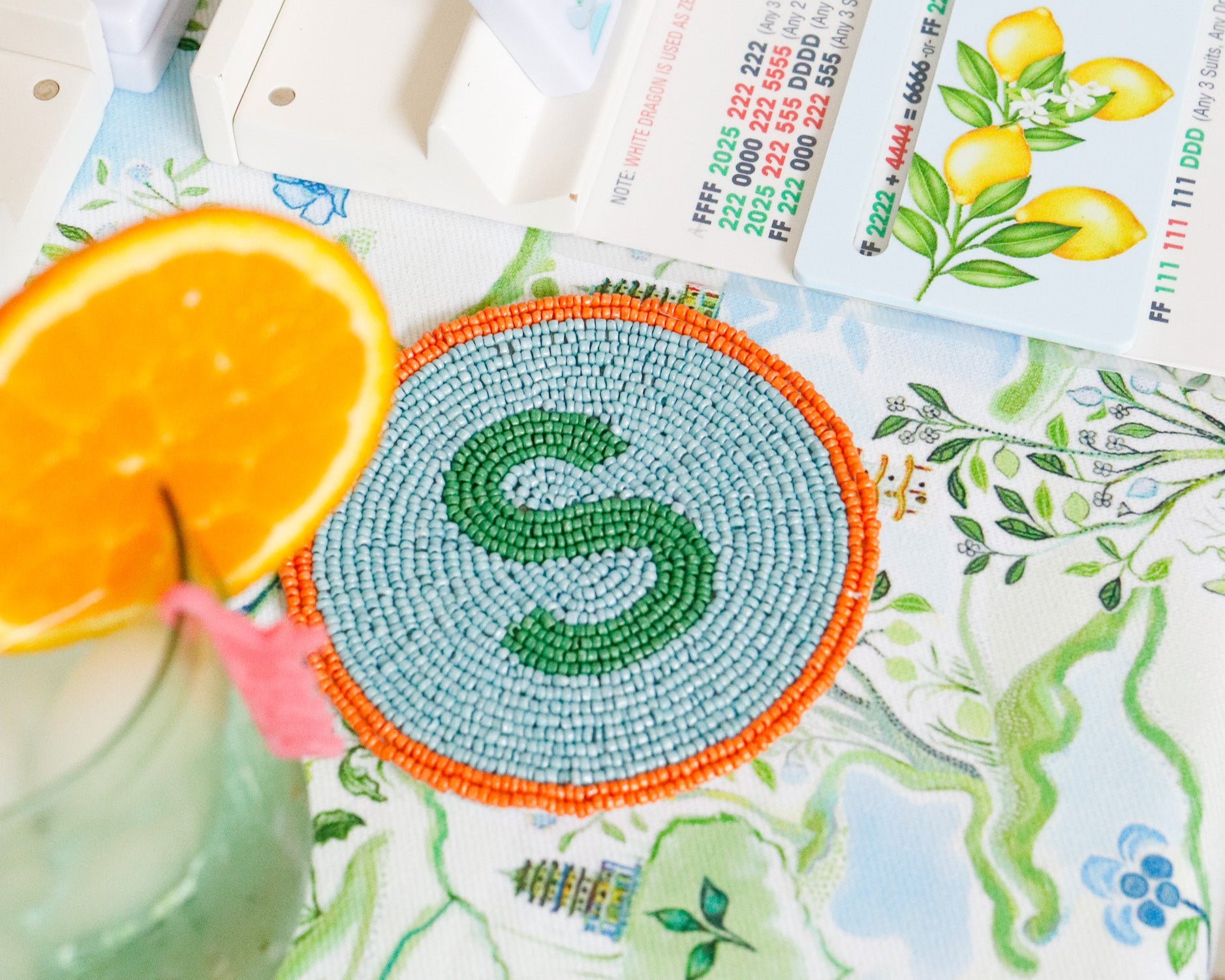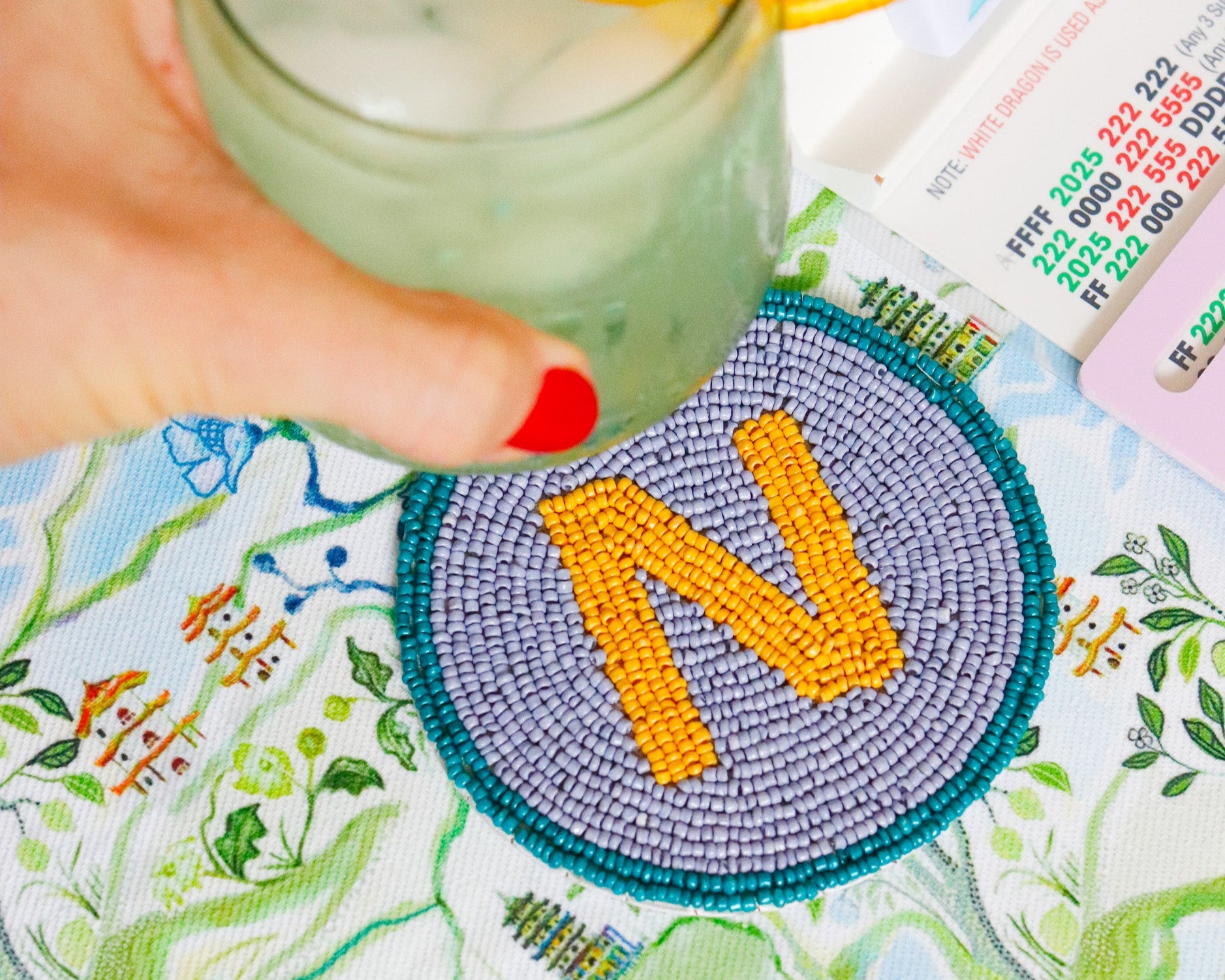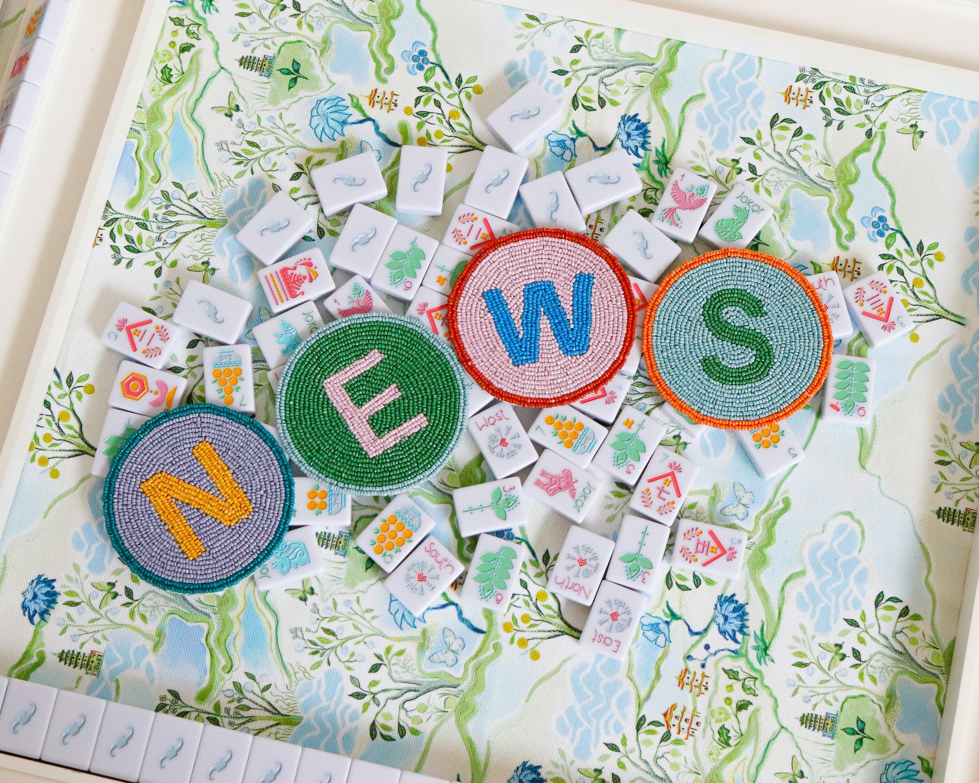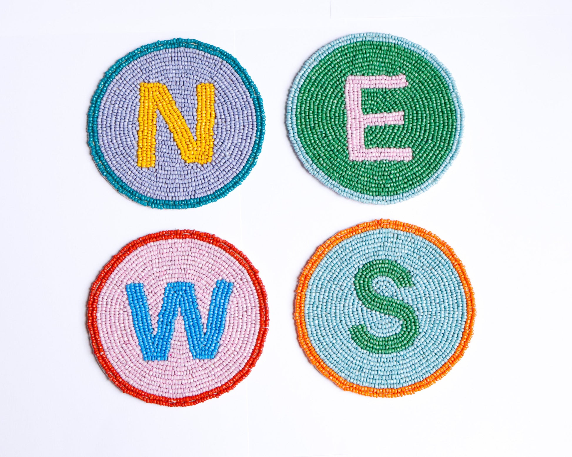 Elevate your mahj cocktail experience with our new hand-beaded coasters. Our Winds coasters are the perfect way to spice up your Mahjong table with color + functionality. FACT: EAST (E) is responsible for initiating the game and breaking the wall of tiles. The position of East rotates counterclockwise after each hand. Use these cute coasters as a fun way to mark the dealer + other spots around the table.